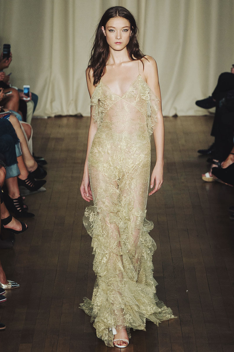If you come to Britain, do it like the Brits. And so for Spring 2015 they did, taking however a different take on British royalty less modern and more '70s, less gilded and more Woodstock. A "rock-'n'-roll fantasia" as Tim Blanks called it, the collection was opened by Georgia May Jagger, looking every inch the flower-child as she sauntered down the runway in a flowy V-shaped tiered white tulle and lace number. “She really embodies the spirit of the new collection,” said Chapman. “It’s a little bit gypsy, a little bit Woodstock and a little bit rock ’n’ roll.” As the show went on, it looked as if all the pieces were made for goddesses : there was the gypsy-hippie lass in her bohemian guipere gowns, the rock-chick in her lace trousers and crop top with hair tousled and eyes smoked to perfection, as well as the cultured romantic adorned with polished silhouettes of billowing organza sleeves and gold flower embroideries.